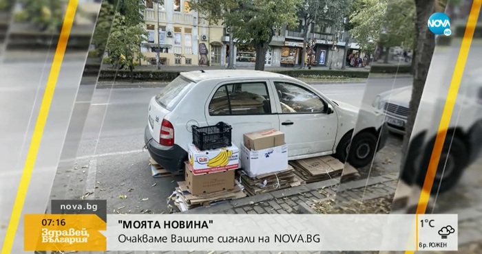 Той е изпратил снимки в рубриката "Моята новина". На тях се вижда автомобил, паркиран близо до общината, около който е пълно с кашони и боклуци.