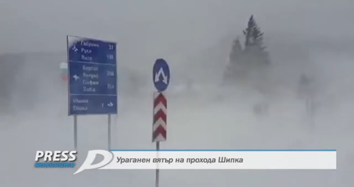 За ураганен вятър на прохода "Шипка" става ясно от кадри на PRESS TV.