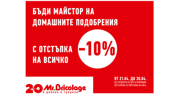 Пазарувай от Mr. Bricolage и вземи 10% отстъпка на ВСИЧКИ стоки, без тези в промоция, от 21 до 30 април. Освен от магазина, можеш да направиш поръчка и онлайн на www.mr-bricolage.bg, както и по телефон или Viber на 0882 359 199. Поръчките по телефон или Viber на стойност над 100 лв. са с БЕЗПЛАТНА ДОСТАВКА в рамките на Варна, а над 200 лв. – и извън града. Магазинът във Варна работи при засилени мерки за дезинфекция и безопасност!