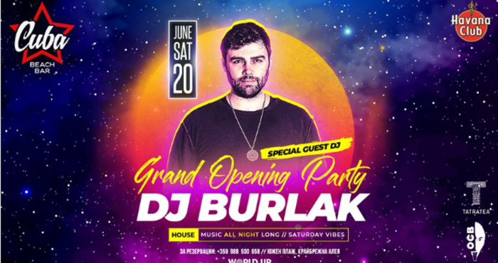 DJ BURLAK ще разтърси най-ГРАНДиозното заведение на Варненския плаж, CUBA Beach Bar, в събота вечерта. Стартът на лято 2020 ще бъде зашеметяващ със стилното специално парти на нашия гост! Обещаваме взрияващи емоции, безкомпромисен саунд, свеж аромат на море и обаятелна електронна музика!