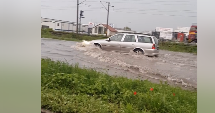 На тях се вижда как лек автомобил „плава” в буйните води.