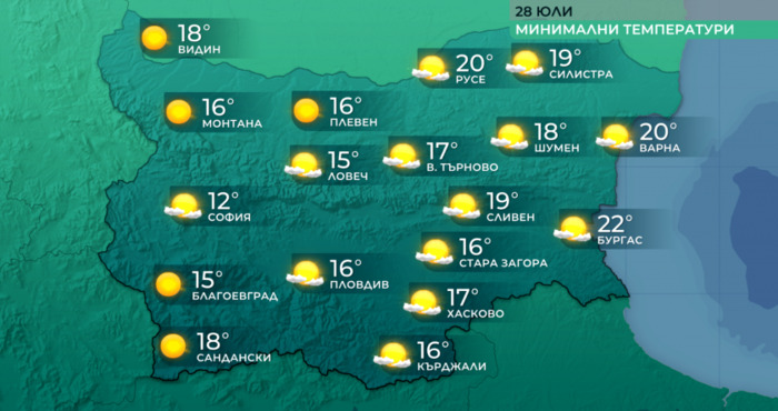 По Черноморието ще бъде предимно слънчево. Ще духа до умерен вятър от север-североизток. Максималните температури ще са от 29°до -32°. Температурата на морската вода е 26°-27°. Вълнението на морето ще е 2 бала.