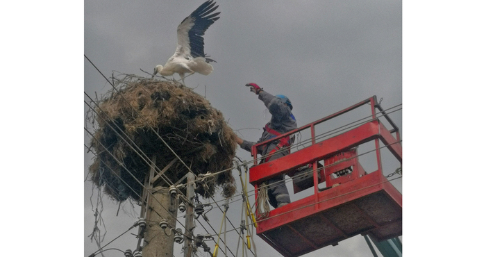 Екип на ЕРП Север организира спасяването на щъркел, оплетен във въже, висящо от гнездо в опасна близост до проводниците от електроразпределителната мрежа на шуменското с. Тръница. Въжето е било използвано от птицата при изграждането на гнездото. Сигналът за бедстващия щъркел е подаден от РИОСВ в община Нови пазар.
