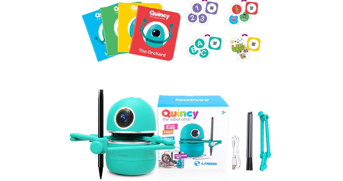 Quincy пристига с цял куп допълнителни подаръци, включително 24 карти за рисуване, още толкова с букви, 10 карти с цифри, 4 карти за математически предизвикателства и 4 различни нива на активност, плюс 2 химикала, ако случайно, докато гледате детето ви колко се забавлява, не ви се прииска и вие да порисувате с робота.