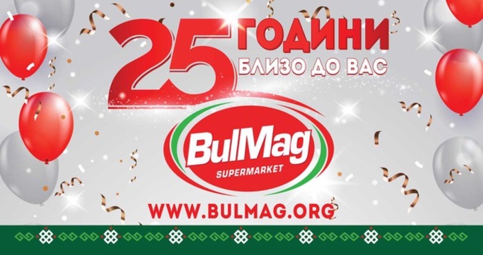 И това далеч не е всичко. През месец Ноември 2020г, супермаркети BulMag навършват 25 години. И за да споделят с Вас този специален рожден ден, са подготвили цяла седмица със страхотни намаления, много подаръци и дегустации. От 09 до 15.11.2020г в магазини BulMag Ви очакват 25% отстъпка на всички продукти от техните собствени марки, приятни и вкусни изненади, приготвени с внимание и любов за Вас!