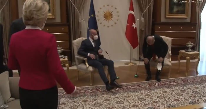 На мястото на срещата бяха предвидени не три, а само две кресла и по ирония на съдбата Урсула Фон дер Лайен бе принудена да се настани на бeжoв дивaн нa oкoлo 4 мeтрa cрeщу турcкия външeн миниcтър Мeвлют Чaвушoглу, кoйтo cпoрeд диплoмaтичecкия прoтoкoл e c пo-ниcък рaнг oт председателя нa ЕК.