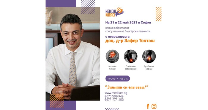 На 21 и 22 май за пореден път и с голямо удоволствие посрещаме отново един от най-търсените от българските пациенти турски неврохирург - доц. д-р Зафер Токташ. Авторитетният неврохирург от турската болница „Медикал Парк Пендик“ ще проведе БЕЗПЛАТНИ КОНСУЛТАЦИИ на български пациенти с мозъчни тумори и гръбначни заболявания на 21 и 22 май 2021г. в гр. София. Той ще гостува по покана на управителя на ЗИЦ “Медикъл Караджъ“ – Звезделина Лютфи и в рамките на инициативата на здравния информационен център за предоставяне на достъп до най-иновативните и модерни технологии в медицината.