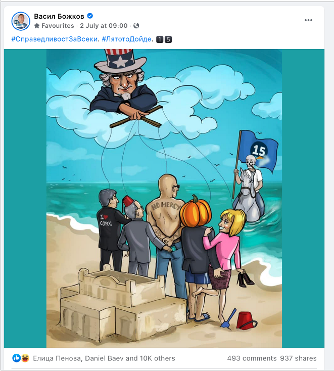 Запитан за коалиции, Божков е категоричен, че няма да участва в такива със статуквото, а що се отнася до Слави, той изрази притеснение, че неговата партия, на практика вече не е негова. Факт, който се разкрива и от карикатурите му във Фейсбук, където в джоба на висок гологлав мъж, друг мъж с фес пуска пачки в задния джоб зад гърба на всички.
