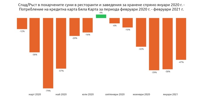 Интересни са и данните за другия най-засегнат икономически сектор – ресторанти и заведения за хранене. През януари 2021 г., по време на втория локдаун, спадът в потреблението в ресторанти и заведения за хранене достига до 58%.
