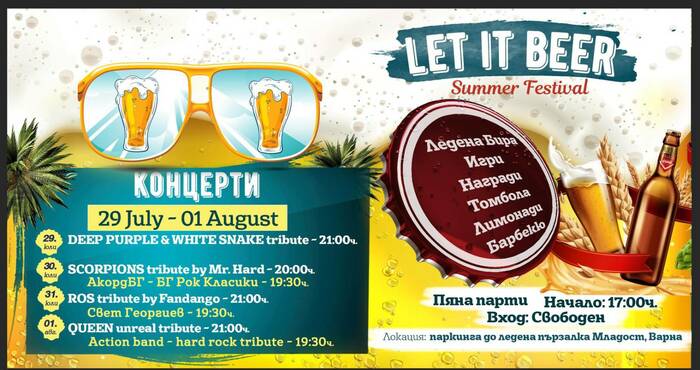 Битката с високите температури продължава с пълна сила, благодарение на предстоящото второ издание на фестивала Let it BEER във Варна. Събитието ще разхлади и зареди подобаващо всички свои гости в дните от 29-ти юли до 1-ви август. Началният час е 17:00 часа, а локацията е паркингът до Ледената Пързалка в жк. „Младост”.