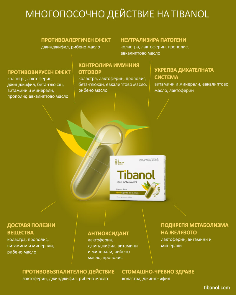 Във формулата му са включени вещества от пълния спектър естествени имуностимулатори. Всяка съставка активира защитните сили по различен начин – като се започне от евкалиптовото масло, което подобрява състоянието на дихателната система, за да се мине през прополиса, известен със своята способност да унищожава болестотворни бактерии, и се стигне до бета-глюкана, чийто противогрипен ефект е неоспорим. Ключови за високата му ефективност обаче са две специални съставки – коластра и лактоферин. За тях лекарите са категорични, че са тежката артилерия, когато става дума за противовирусен отпор. Благодарение на всичко това Tibanol успява да запуши пробойните в имунитета и да активира защитните сили, правейки тялото неподатливо на външни атаки.