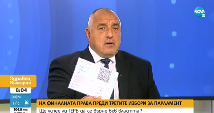 Това е моят зелен сертификат, ето показвам го. Поискайте Румен Радев да покаже неговия, да каже с каква ваксина е ваксиниран, защото аз не вярвам, че се е ваксинирал. Това антиваксърство, неговото и на Кацаров, доведе България дотук. Днес отново имаме 200 починали, и Румен Радев казва, че това е успешно водене на кампанията. Това каза Бойко Борисов по Нова Тв.