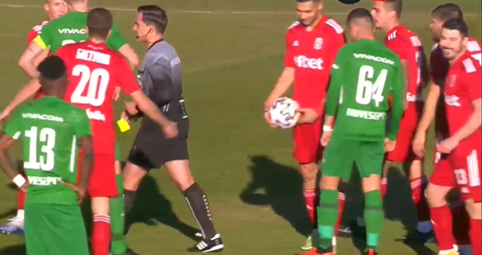 В 5-ата минута Оливие Вердон спря с ръка извеждащ пас към Георги Русев, който щеше да се озове очи в очи с Кристиян Кахлина. Първоначално главният рефер Георги Димитров показа жълт картон на национала на Бенин. След намесата на ВАР съдията промени решението си и изгони защитника с червен картон. От последвалия пряк свободен удар Ивайло Чочев стрепя опасно над вратата.