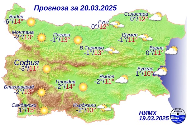 През нощта ще бъде ясно и почти тихо. По-значителни увеличения на облачността ще има над източните райони, там и вятърът ще е слаб от северозапад. В сутрешните часове на отделни места в равнините ще има условия за намалена видимост. Минималните температури ще бъдат между минус 5° и 0°, в София – около минус 3°. Утре в по-голямата част от страната ще бъде слънчево. Над източните райони облачността ще се задържи по-често значителна. Ще духа слаб вятър от север-североизток. Максималните температури ще бъдат между 9° и 14°, в София – около 11°.