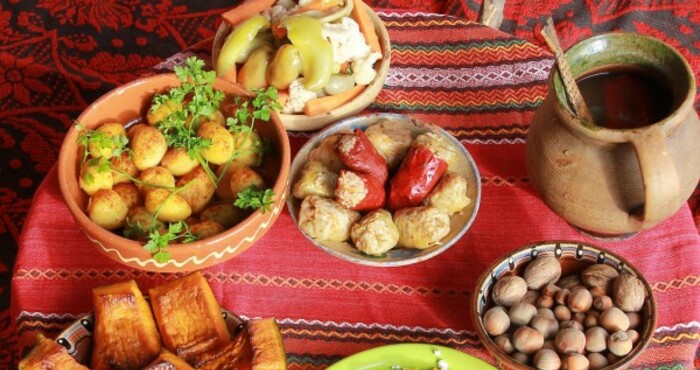 Върху празничната бъднивечерска трапеза стопанката нарежда обредния хляб – “боговица”, “богова пита”, “божичник”, “вечерник”, “светец” или “харман”. Той е замесен с “мълчана вода”, налята мълчешком от момата или младата булка в семейството. Брашното за хляба се пресява през три сита. От тестото се оформят купните на нивата и домашните животни. Освен този хляб, момата меси и “вит-превит кравай”, който е предназначен за коледарите. На трапезата се слагат и останалите блюда – пълнени чушки или сарми с ориз, варен фасул и варена леща, жито, ошаф и орехи. Колкото са повече ястията, толкова по-богата ще е годината. Под трапезата стопанката разстила слама, която се асоциира със сеното в яслата на новородения Христос. Тази слама не се хвърля. Тя се поставя в градините или под плодните дръвчета, за да раждат повече.