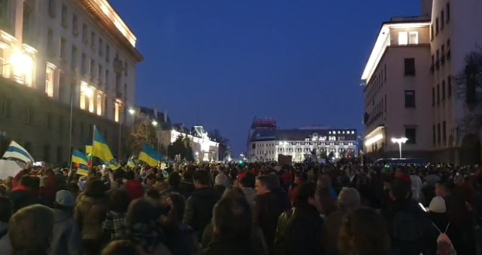 19:00 ч. - Демонстрантите издигнаха 10-метров флаг на Украйна. Множеството скандира "Слава на Украйна" и "Не на войната"