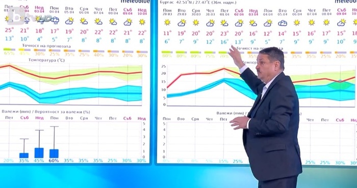 Той прогнозира за следващите дни високи температури, които ще са твърдо над 20 градуса. „Март месец в Северна Европа беше топло, ние изпукахме от студ. Сега нещата се обръщат”, обясни проф. Рачев. Той прогнозира, че в четвъртък и петък максималните температури у нас ще са близо 25 градуса. Валежите ще са от летен тип. Очаква се и нова порция запрашаване на въздуха, идващо от Африка.