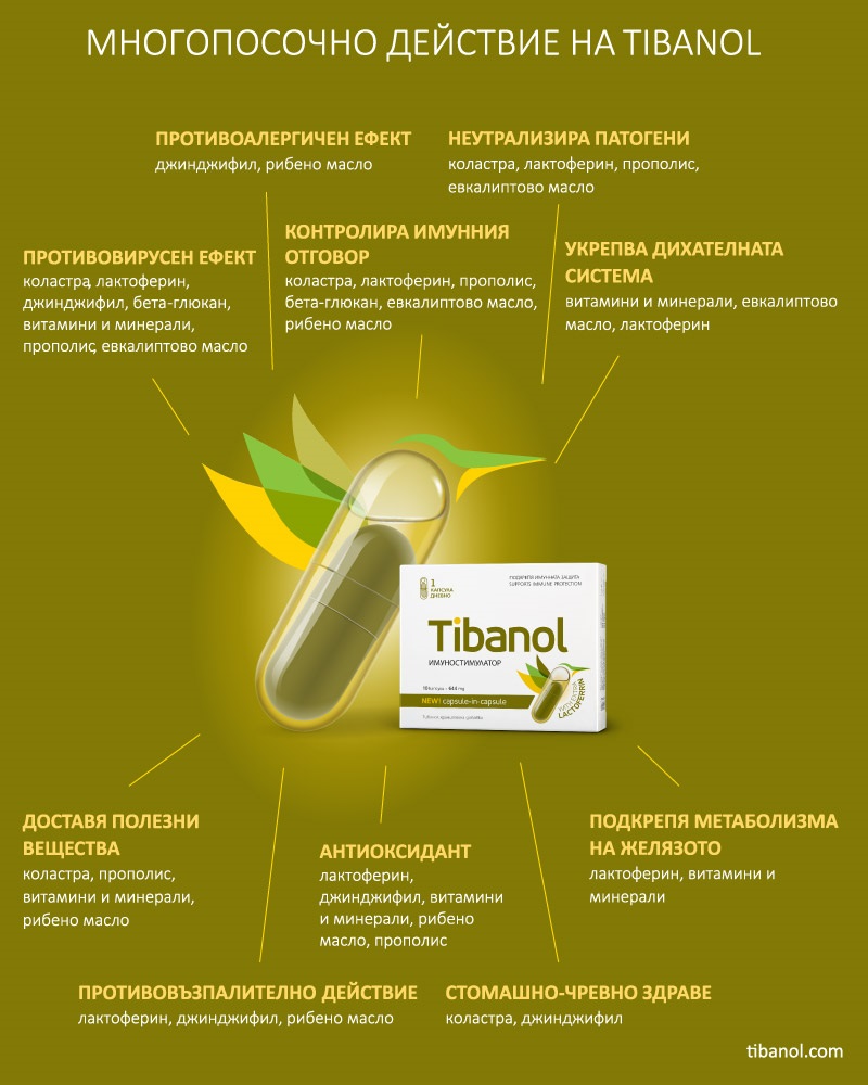 Уникалната селекция от природни вещества в Tibanol наподобява специализиран медицински екип. Със способността си да улавя и „изяжда“ различни причинители на болести бета-глюканът изпълнява ролята на спешно звено. Веднага след него случая поема коластрата, която като своеобразен специалист по вътрешни болести поддържа в норма „жизнените показатели“ на имунитета ни. На помощ се притичат още инфекционистът, токсикологът и алергологът в лицето на прополиса, джинджифила и рибеното масло. За дихателната система отговаря пулмологът в групата – евкалиптовото масло. Присъстващите в Tibanol витамини А, С, D и В12 плюс минералите цинк и селен, подобно на опитни медицински сестри, подсигуряват ефективната работа на „лекарския екип“. Всички те мобилизират противовирусните агенти в тялото, активират веществата, потушаващи възпаленията, и стимулират клетките убийци. Резултатът е препрограмиране на нашия „биологичен код“, което с болничната терминология може да се опише като „трансплантация на имунитет“. Сложната „операция“ се случва под зоркото око на началника на екипа – необикновеното вещество лактоферин. Като същински генерал той следи работата изкъсо и гарантира, че имунната реакция съответства на атакуващия ни в момента враг. Така Tibanol осигурява защита с пълно покритие, а имунната реакция е премерена по сила и прецизно насочена.