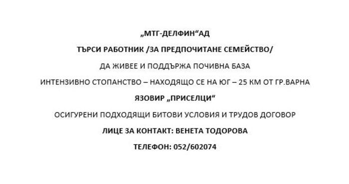 ТЪРСИ РАБОТНИК /ЗА ПРЕДПОЧИТАНЕ СЕМЕЙСТВО/