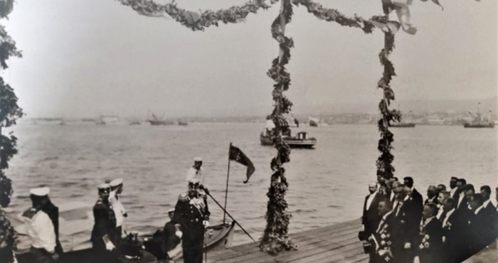 Фигура 1 Княз Фердинанд I слиза в подножението на фара на новото пристанище за церемонията по откриването. Посрещнаст е от делегация, водена от министър Д. Петков, 18 май 1906г.