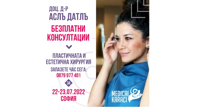 На 22-23 Юли 2022г. в София гост на ЗИЦ „Медикъл Караджъ“ ще бъде водещият турски пластичен хирург – доц. д-р Аслъ Датлъ. Тя ще ни гостува по покана на нашия управител Звезделина Лютфи. В рамките на деня, специалистът ще проведе напълно безплатни консултации на българските пациенти, които искат да се запознаят с най-новите тенденции и практики в естетичната и пластична хирургия. Това, което трябва да направят пациентите, желаещи да се възползват от безплатната консултация със специалиста е да се обадят на телефоните на Здравния център +359879977402, +359879977401 и да запишат час за консултация.