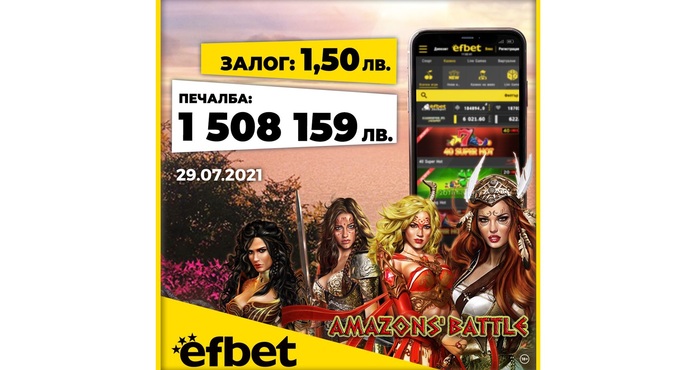 Един от водещите букмейкъри в България – efbet, отбелязва една година от падането на най-големия джакпот в историята на компанията. На този ден (29.07.2021 г.) клиент с огромен късмет си спечели малко над 1.5 милиона лева в казино секцията на efbet.com, превръщайки забавлението си в огромна печалба.