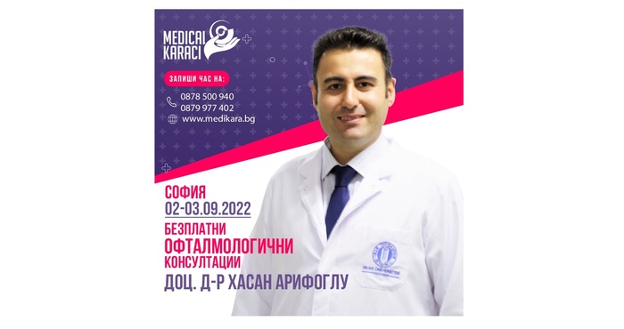 На 2-ри и 3-ти Септември 2022 в гр. София с голямо удоволствие посрещаме отново офталмолога доц. д-р Хасан Арифоглу. Авторитетният офталмолог от университетската болница „Окан“ в Истанбул ще проведе БЕЗПЛАТНИ КОНСУЛТАЦИИ на български пациенти с очни заболявания на 2-ри и 3-ти Септември 2022 в София. Той ще гостува по покана на управителя на ЗИЦ “Медикъл Караджъ“ – Звезделина Лютфи и в рамките на инициативата на здравния информационен център за предоставяне на достъп до най-иновативните и модерни технологии в медицината.