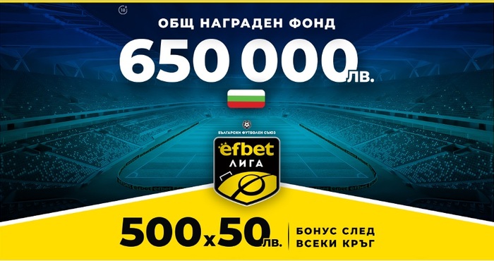 В петък следобед стартира поредният кръг на efbet лига, като букмейкърът, който е и официален спонсор на първенството, продължава с ексклузивното си предложение за привържениците на родния футбол. През този футболен сезон efbet раздава по 50 лева на 500 клиента на сайта си след всеки кръг на efbet Лига, a печелившите се изтеглят измежду всички, добавили поне една среща от шампионата в множествен залог. Повече информация за играта тук!