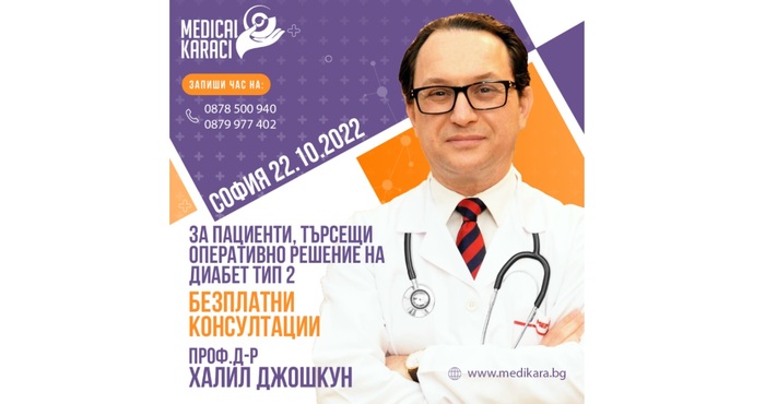 Всички пациенти с наднормено тегло и диабет тип 2 ще имат възможност да се консултират БЕЗПЛАТНО с водещия специалист от Турция на 22 октомври 2022 година. Проф. д-р Халил Джошкун има богат опит и е извършил повече от 4000 лапароскопски бариатрични и метаболитни операции. Сред пациентите му има и много българи. Той ще гостува по покана на управителя на ЗИЦ „Медикъл Караджъ“- Звезделина Лютфи и в рамките на инициативата на здравния информационен център за предоставяне на достъп до най-иновативните и модерни технологии в медицината.
