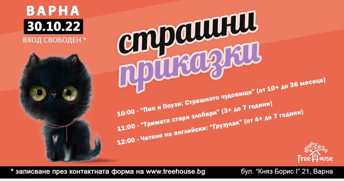 Интересна програма за най-малките са подготвили тази неделя момичетата от новооктрития магазин за съвременни детски книжки и красиви дървени играчки TreeHouse в центъра на Варна (на ъгъла между бул. “Княз Борис I” 21 и ул. “Иван Вазов” 2). След поредица успешни четения за деца, те инициират маратон със Страшни приказки, с който да отбележат края на месеца. Събитието ще се състои на 30-ти октомври и ще включва поредица от четения. За първи път в програмата им ще откриете “Четене за бебета”, както и “Приказка на английски език”. Всички заглавия са на световноизвестния тандем Джулия Доналдсън и Аксел Шефлър, а в оригинал от мис Мей ще бъде прочетен техният бестселър с над 20-годишна история за най-обичаното чудовище по света “Грузулак”.