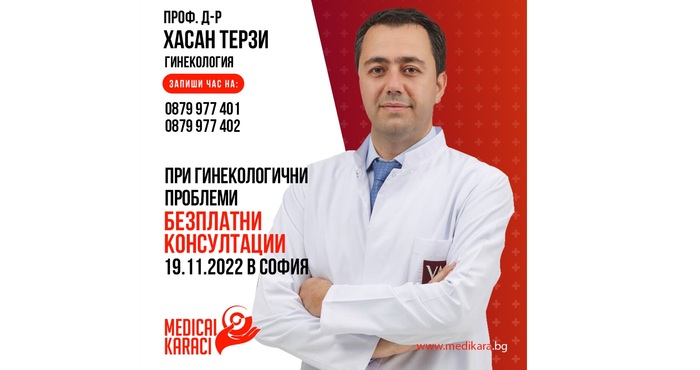 Всички пациенти, които имат нужда от лечение на гинекологично заболяване или репродуктивен проблем, могат да проведат безплатна консултация с акушер-гинеколога- проф. д-р Хасан Терзи. Желаещите да се възползват от БЕЗПЛАТНАТА консултация със специалиста могат да се обадят на телефоните на здравния център- 0879 977 402; 0878 500 940 и да си запишат час.