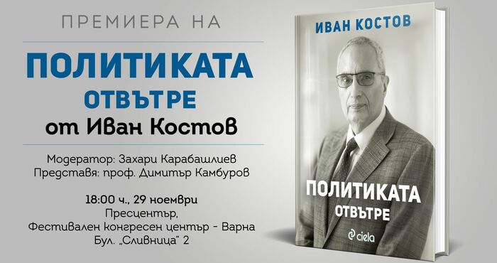 Иван Костов - министър-председателят на България в периода 1997-2001 г., идва във Варна по покана на читатели за разговор, посветен на новата му книга “Политиката отвътре”. Написването ѝ е отнело близо 20 години, а бившият премиер определя труда си като своето политическо завещание.
