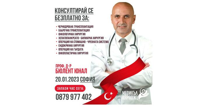 Желаещите да се възползват от възможността за безплатна консултация с проф. д-р Бюлент Юнал в на 20-ти януари 2023 г. в гр.София, трябва да си запишат час предварително на телефоните на „Медикъл Караджъ“: 0879 977 401 и 0879 977 402 или да заявят желания от тях час онлайн на www.medikara.bg.