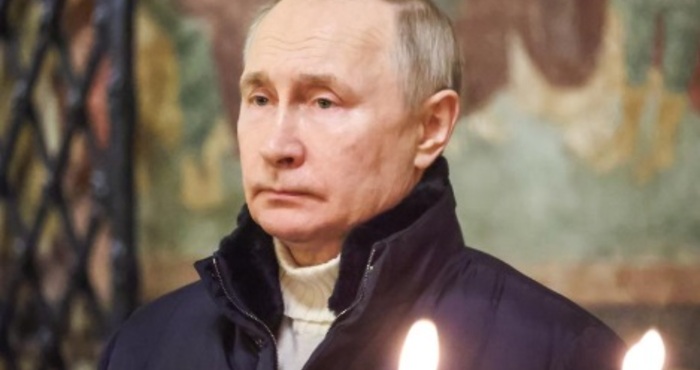Държавната телевизия показа два клипа на живо, на които се вижда как Путин е в катедралата "Благовещение", докато православни свещеници извършват среднощната служба.