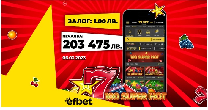 Датата 06.03.2023 г. ще остане в паметта на щастлив потребител на платформата, след като на играта 100 Super Hot той си завоюва 203 475 лева - натрупаната сума в прогресивния джакпот "пика".