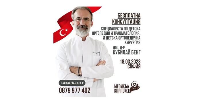 На 18-ти март 2023г. в София ЗИЦ “Медикъл Караджъ“ посреща детския ортопед от световна класа- Доц. д-р Кубилай Бенг. Авторитетният ортопед от болница „Медикъл парк“, Истанбул ще проведе БЕЗПЛАТНИ КОНСУЛТАЦИИ на деца със заболявания на опорно-двигателния апарат, които имат нужда от второ медицинско мнение и интерес към възможностите за лечение в чужбина на своето заболяване.