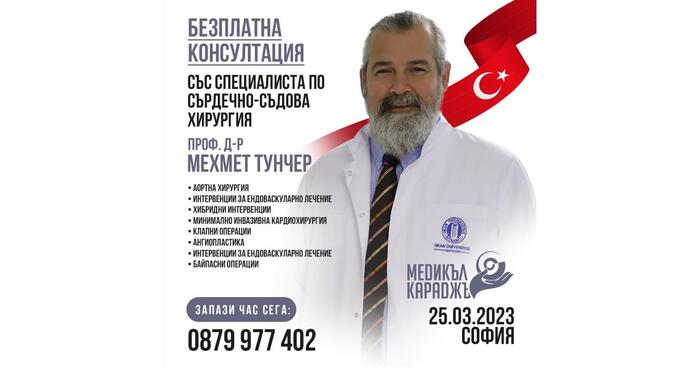 На 25-ти март 2023 година в гр. София ЗИЦ “Медикъл Караджъ“ посреща за пръв път сърдечно-съдовия хирург проф. д-р Мехмет Тунчер. Авторитетният специалист от университетската болница „Окан“ в Истанбул, ще проведе БЕЗПЛАТНИ КОНСУЛТАЦИИ на деца над 6 години и възрастни пациенти със сърдечни заболявания, които имат нужда от второ медицинско мнение и интерес към възможностите за хирургично лечение в чужбина на своето сърдечно заболяване.