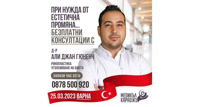 На 25-ти март 2023 година в гр. Варна, ЗИЦ “Медикъл Караджъ“ посреща за първи път специалиста по пластична и естетична хирургия- Д-р Али Джан Гюненч. Авторитетният специалист от болница „Медикъл парк“ в Истанбул, ще проведе БЕЗПЛАТНИ КОНСУЛТАЦИИ на български пациенти, които имат необходимост от пластична и естетична хирургия, и които имат нужда от второ медицинско мнение и интерес към възможностите за хирургично лечение в чужбина на техния естетичен проблем.