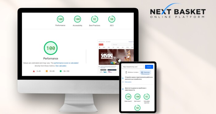 Най-новата платформа за изграждане на онлайн магазини NEXT BASKET тества един от първите си сайтове в инструмента за измерване на скорост и оптимизация на Google.