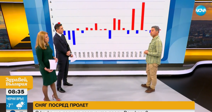Иначе този снеговалеж, който е в момента навън в София, не само, че не е необичаен, но ако се върнем 60 години назад в архивите и преброим колко дни снежна покривка има в София, ще видите, че е имало доста случаи на сняг през април в София. Рекордьори са средата на 90-те години, когато е имало по пет-шест дни през април сняг, 97-ма е може би емблематичния април. Не само за София, а за цялата страна, това е най-студеният април в нашата история. И през 96-а, и пре 97-ма по планините снежната покривка беше 25-30 см, съчетано със студа тези години бяха и гладни, допълни Симеон Матев.