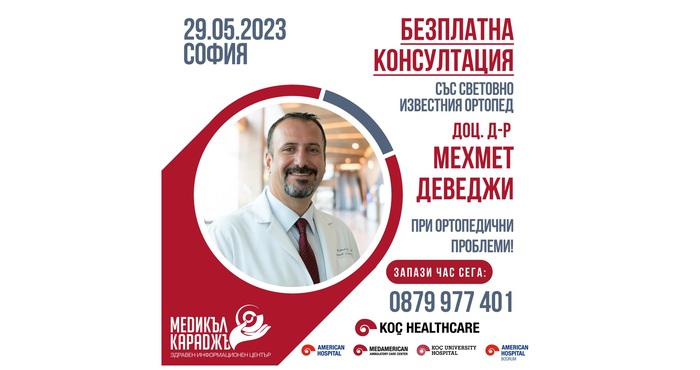 Желаещите да се възползват от възможността за безплатна консултация с Доц.д-р Мехмет Али Деведжи в София на 29-ти май 2023г. в София трябва да се запишат предварително на телефоните на ЗИЦ„Медикъл Караджъ“: 0879 977 402 или 0879 977 401, или да заявят желания от тях час онлайн на www.medikara.bg.