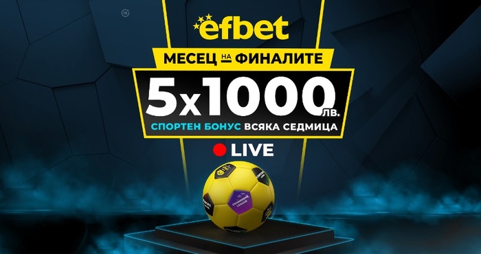 "Месец на Финалите" е специален промоционален период в efbet, по време на който компанията, в рамките на 5 седмици, раздава по 5 седмични награди по 1000 лева на избрани потребители, покрили условията на предложението.