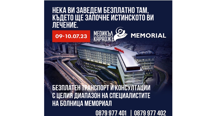 Здравен информационен център „Медикъл Караджъ“, съвместно с Група Болници Мемориал, имат удоволствието да предоставят възможност на българските пациенти, които биха искали да се консултират със специалисти на световно ниво за свой здравословен проблем, да се възползват от БЕЗПЛАТЕН ТРАНСПОРТ и ПРЕГЛЕД НА ПРОМОЦИОНАЛНА ЦЕНА ОТ 80 ЕВРО на 09-10.07.23.
