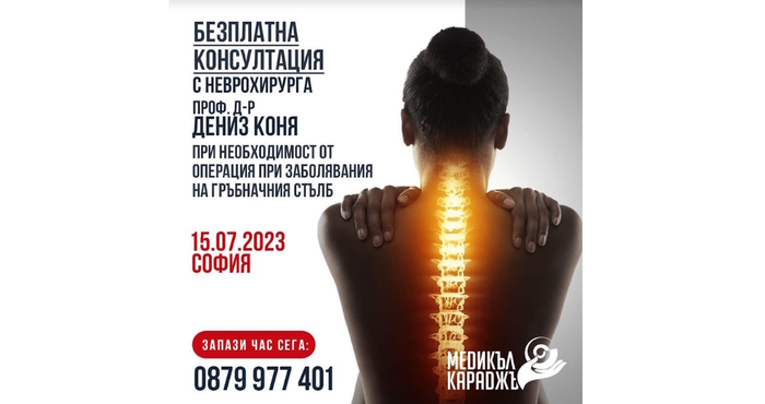 Всички пациенти със заболявания на гръбначния стълб и гръбначния мозък, могат да се възползват и да проведат безплатна консултация с неврохирурга, относно възможностите за лечение на своето заболяване. Желаещите да се възползват от БЕЗПЛАТНАТА консултация със специалиста, могат да се обадят на телефони 0879 977 402 или 0879 977 401 и да си запишат час.