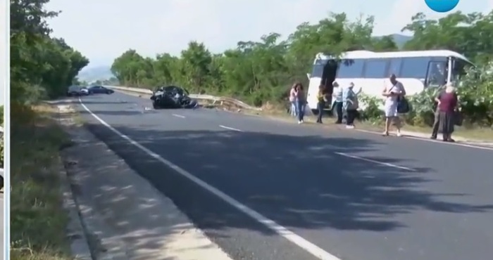 Автомобил с 82-годишен водач се е ударил в пътнически автобус. Водачът на колата е загинал на място, а от автобуса са пострадали шестима души. Движението е затворено.