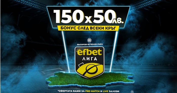 Платформата за онлайн спортни залози - efbet.com, предлага интересни коефициенти за бъдещ шампион и за първия кръг от първенството, докато в същото време компанията, която е и генерален спонсор на родния елит, предлага и нов бонус за мачовете - Бонус 150х50 лв. след всеки кръг.