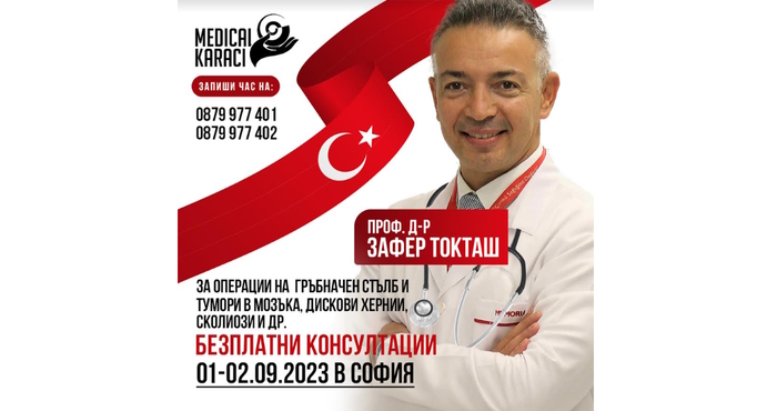 През Септември, с голямо удоволствие ще посрещнем отново, един от най-търсените от българските пациенти турски неврохирург – проф. д-р Зафер Токташ. Авторитетният неврохирург от турската болница „Мемориал “Аташехир ще проведе БЕЗПЛАТНИ КОНСУЛТАЦИИ на български пациенти с мозъчни тумори и гръбначни заболявания на 01-ви и 2-ри Септември 2023г. в София. Той ще гостува по покана на управителя на ЗИЦ “Медикъл Караджъ“ – Звезделина Лютфи и в рамките на инициативата на здравния информационен център за предоставяне на достъп до най-иновативните и модерни технологии в медицината.