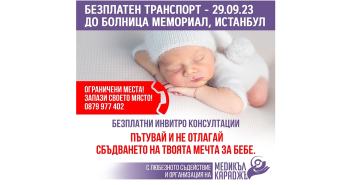 Здравен информационен център „Медикъл Караджъ“, съвместно с Група Болници Мемориал, имат удоволствието да предоставят възможност на всички български двойки с репродуктивни проблеми да се възползват от БЕЗПЛАТЕН ТРАНСПОРТ и БЕЗПЛАТНА КОНСУЛТАЦИЯ с водещи специалист по ин витро оплождане. Не пропускайте възможността да се консултирате с едни от най-добрите специалисти в света и да се приближите с още една крачка до сбъдването на мечтата ви за собствено дете!