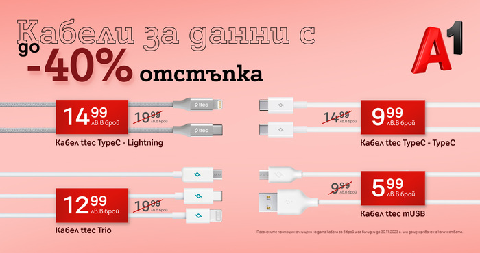 А1 предлага специални отстъпки до 40% от цената за над 40 вида дейта кабели от водещи производители. В селекцията на A1.bg потребителите могат да избират между дейта кабели от марки като Apple, Samsung, TTEC, и много други. Промоционалните цени са валидни за закупуване от сайта А1.bg и в търговската мрежа на телекома до изчерпване на наличностите.