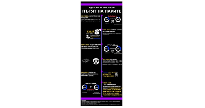 Обявеното на 9.11.2023 г. намерение от собственика на United Group за придобиване на Булсатком официално потвърждава схемата, за която А1 и други пазарни играчи сигнализираха още в края на миналата година. Тогава предупредихме публично, че Виваком ще се опита да погълне Булсатком от настоящия му собственик, който го е купил със заем от United Group.